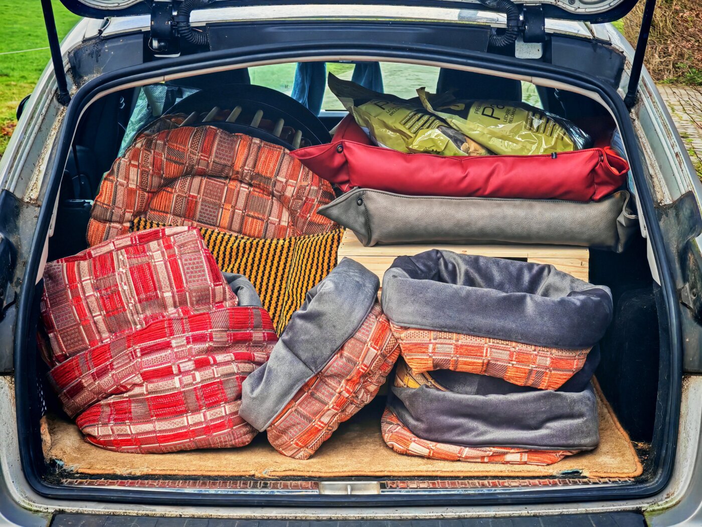 Der Kofferraum mit unseren selbst gebauten Katzenmöbeln und selbst genähten Katzenkissen war voll.